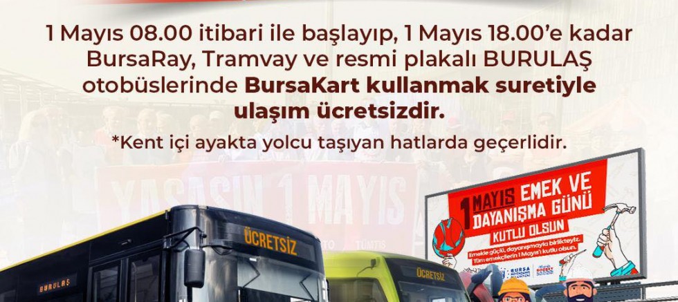 Bursa Büyükşehir Belediye Başkanı Mustafa Bozbey, tüm emekçilerin 1 Mayıs İşçi Bayramı’nı kutladı. Bursa Büyükşehir Belediyesi olarak emeğin ve emekçinin yanında olmaya devam edeceklerini söyleyen Başkan Mustafa Bozbey, “1 Mayıs Emek ve Dayanışma Günü’nde kutlama ve etkinliklerin coşkulu kalabalıklarla yapılabilmesi amacıyla BursaRay ve tramvay hatları ile resmi plakalı Burulaş otobüsleri, 1 Mayıs 2025 Perşembe günü 08.00 ile 18.00 saatleri arasında BursaKart kullanmak suretiyle ücretsiz olarak hizmet verecektir” dedi.