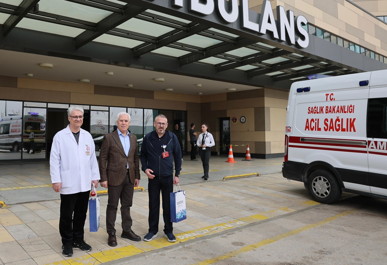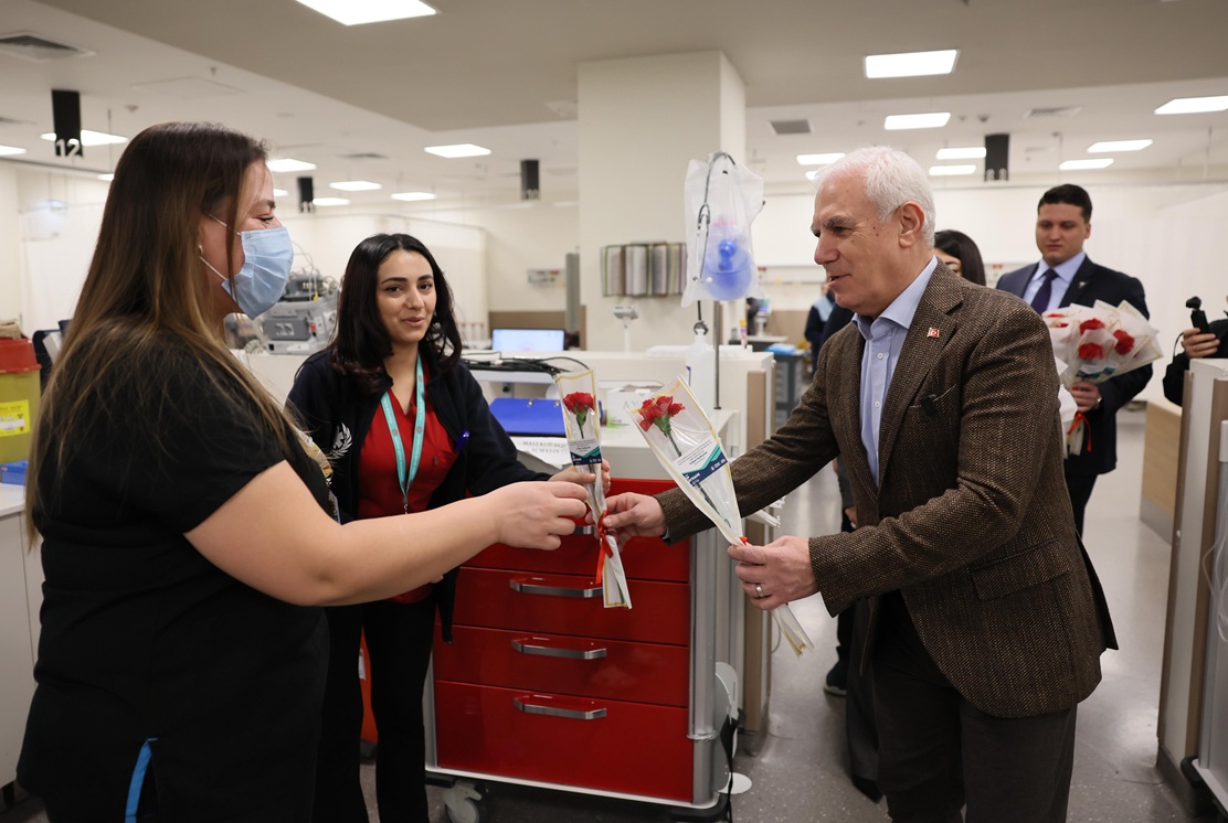 Ardından Bursa Yüksek İhtisas Eğitim Ve Araştırma Hastanesi’ne geçen Başkan Bozbey, hastane yönetimi ve görevli sağlık personelini ziyaret etti. Doktor ve hemşireler başta olmak üzere tüm çalışanların Tıp Bayramı’nı tebrik eden Başkan Bozbey, günün anısına karanfil dağıttı.