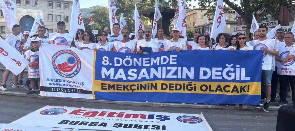 Bursa’da Birleşik Kamu-İş Konfederasyonu düşük ücret zammına karşı Fomara Meydanı'nda basın açıklaması gerçekleştirdi. Yapılan açıklamayı Birleşik Kamu-İş Konfederasyonu Bursa İl Başkanı Engin Yurdakul okudu.