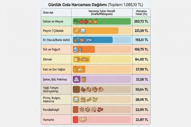Günlük harcamalarda Mart 2026 ortası itibarıyla en yüksek maliyet grubunu 284 liralık harcama ile sebze ve meyve oluşturdu. Onu 222 liralık harcama gereksinimi ile süt ve yoğurt takip etti. Et ürünleri 194 lira harcama gereksinimi ile öne çıkan ürünlerdendi. Yumurta için yapılması gereken harcama tutarı 23 lira olarak gerçekleşti. Kurubaklagil için bu tutar 23, ekmek için 84, katı yağ ve sıvı yağ için 58, şeker, bal, reçel ve pekmez için ise 34 liradır. Kuruyemiş için ise yapılması gereken harcama miktarı 30 lira oldu.