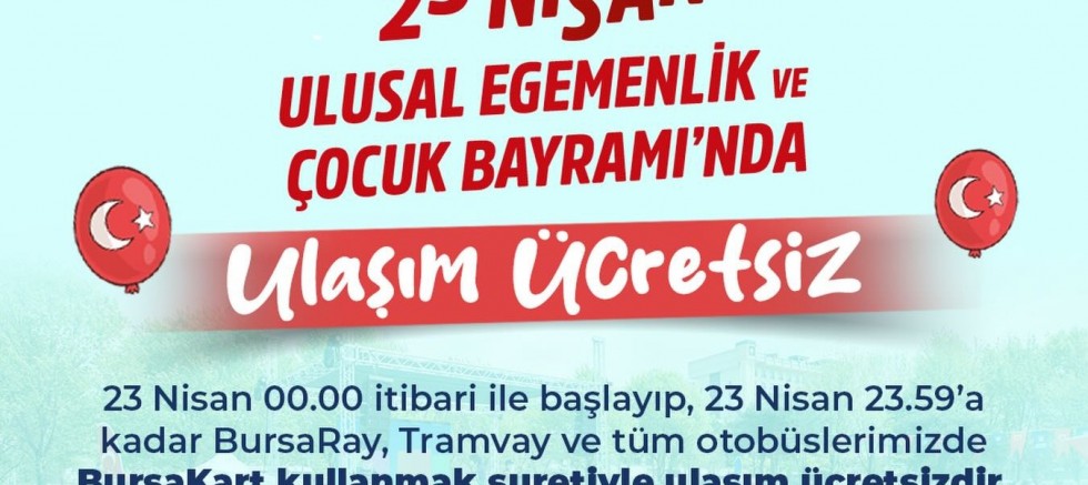 Bursa Büyükşehir Belediyesi, 23 Nisan Ulusal Egemenlik ve Çocuk Bayramı kutlama ve etkinliklerinin coşkulu kalabalıklarla yapılabilmesi için, kent içinde ayakta yolcu taşıyan BursaRay, tramvay ve otobüs hatlarının 23 Nisan günü 00.00 ile 23.59 saatleri arasında BursaKart kullanmak suretiyle ücretsiz olarak hizmet vereceğini açıkladı.