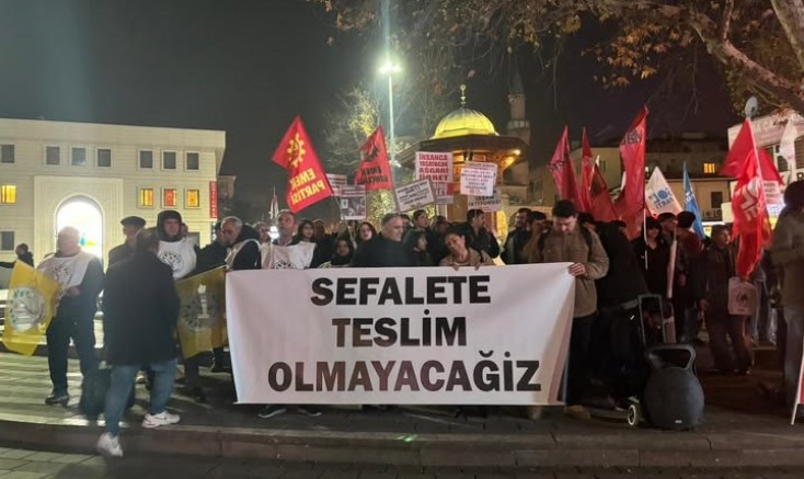 Bursa’da bir araya gelen işçi ve emekçiler asgari ücret eylemi gerçekleştirdi. Yapılan eylemde açlık sınırının altında asgari ücreti, sefalet dayatmasını kabul etmiyoruz denildi.