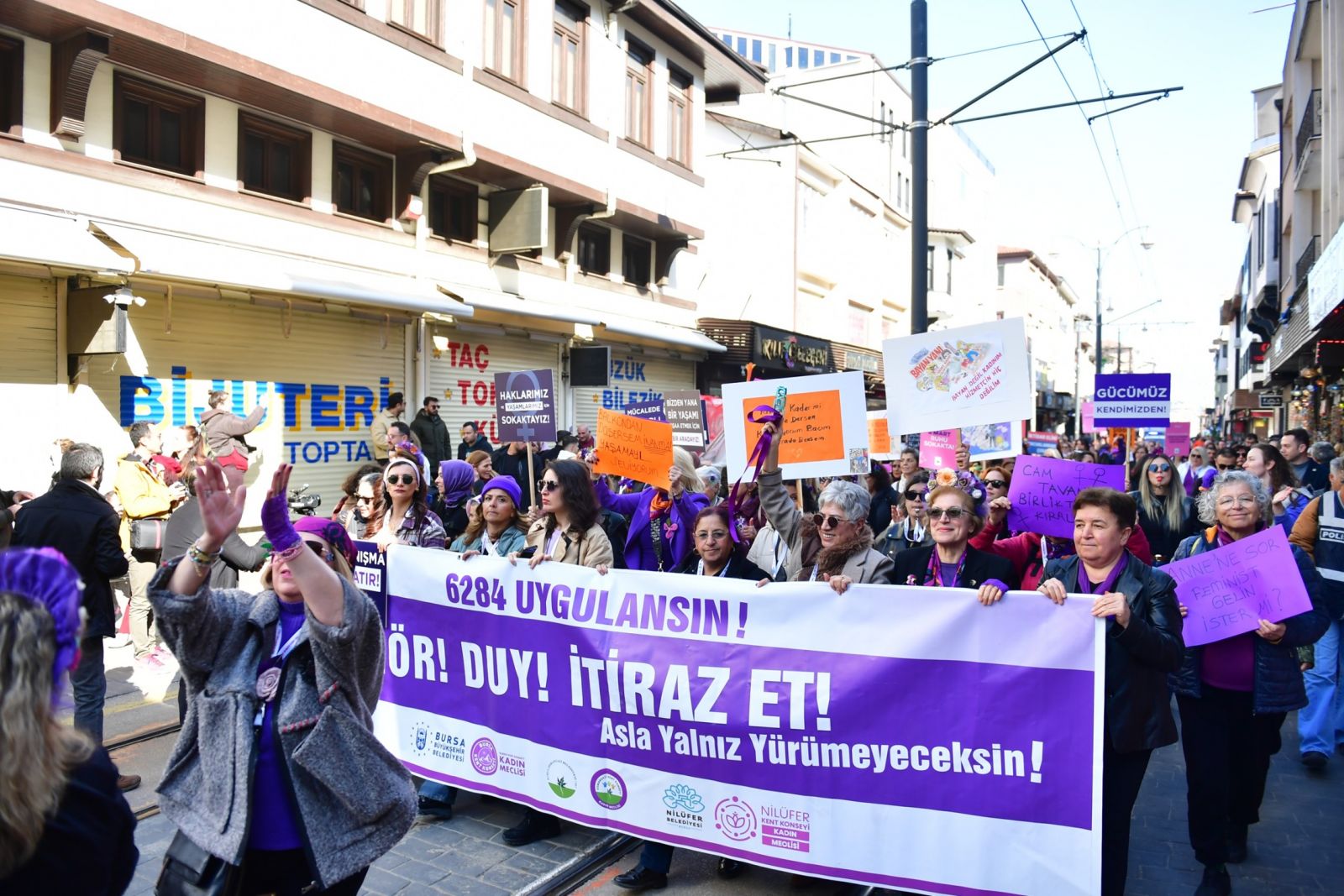 “Saklandığımız yerde değil, buluştuğumuz yerdeyiz. Birbirimizin çaresiyiz” sloganından hareketle Osmangazi Belediyesi, Büyükşehir Belediyesi, Nilüfer Belediyesi ve kent konseylerinin kadın meclisleri öncülüğündeki 8 Mart Dünya Emekçi Kadınlar Günü yürüyüşü, yoğun bir katılım ile organize edildi. Cumhuriyet Caddesi’nden başlayan yürüyüşe katılan kadınlar, Hanlar Bölgesi’ne kadar alkışlar ve ıslıklar eşliğinde ilerledi. Kadınlar, “Dünya yerinden oynar, kadınlar özgür olsa”, “Susmuyoruz, korkmuyoruz, itaat etmiyoruz” sloganlarıyla tepkilerini dile getirirken, haklarının savunucusu olacaklarını hep birlikte ifade etti.