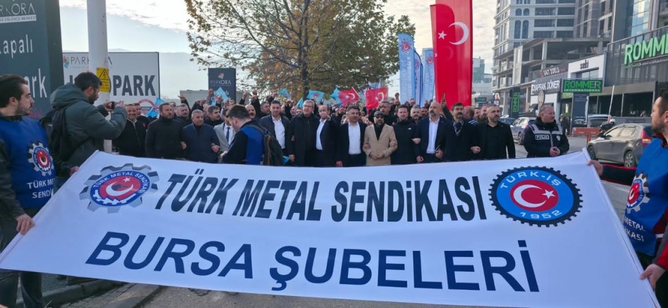 Metal işçileri MESS Bursa Bölge temsilciliği önüne yürüyüş gerçekleştirerek burada basın açıklaması gerçekleştirdi. Yapılan açıklamayı Türk Metal Sendikası Osmangazi Şube Başkanı Erdinç Sazbiçen okudu.