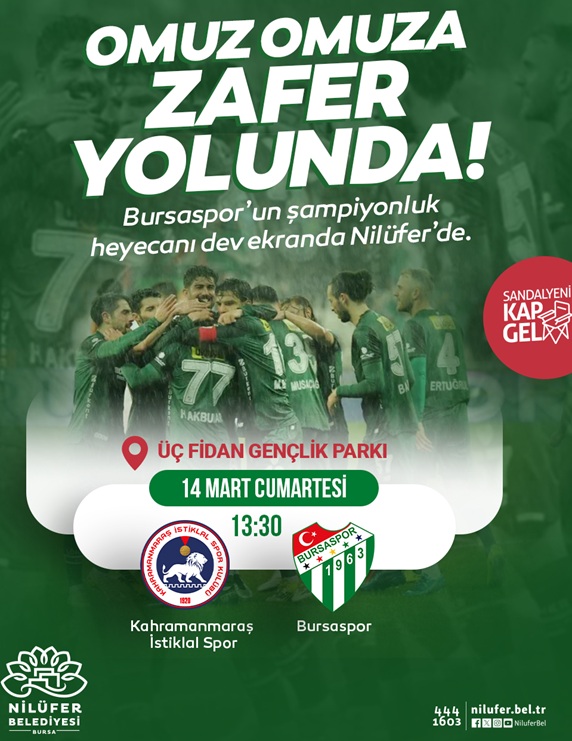 TFF 2. Lig’de şampiyonluk yolunda emin adımlarla ilerleyen Bursaspor, ligin 28. haftasında 14 Mart 2026 Cumartesi günü 13.30’da deplasmanda Akedaş Kahramanmaraş İstiklal Spor ile karşı karşıya gelecek. Nilüfer Belediyesi, Bursaspor taraftarlarının bu önemli maçta takımlarını yalnız bırakmaması için Üç Fidan Gençlik Parkı’nda dev ekran kuracak. Sandalyesini alıp gelen yeşil beyazlı taraftarlar, bu coşkuyu birlikte yaşayacak.