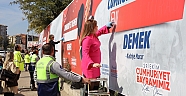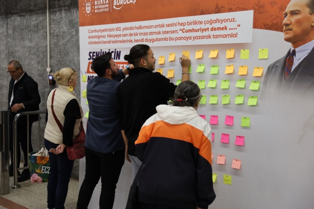 Türkiye Cumhuriyeti’nin 102’nci kuruluş yıl dönümünü büyük bir coşkuyla kutlamaya hazırlanan Bursa Büyükşehir Belediyesi’nin halkın katılımını merkeze alan bir anlayışla başlattığı ‘Cumhuriyet demek…' kampanyası tüm hızıyla sürüyor. Proje kapsamında ‘cumhuriyetdemek.com’ web sitesini ziyaret eden vatandaşlar, “Cumhuriyet demek...” cümlesini kendi duygu ve düşünceleriyle tamamlayarak paylaşıyor. Yapılan değerlendirme sonucunda ‘Bir Çift Mavi Göz’, ‘Özgürlük ve Bağımsızlık’, ‘Kayıtsız Şartsız Egemenlik’, ‘Evladıma Miras’, ‘İnanç ve Cesaret’, ‘Boyun Eğmemek’, ‘Demokrasi’, ‘Çocuğumun Gülüşü’, ‘Kadının Sesi’, ‘Fırsat Eşitliği’, ‘Gülümseyen Gençlik’, ‘Mücadele ve Zafer’, ‘Hak, Hukuk, Adalet’, ‘Vatan Sevgisi’, ‘Bilimle Aydınlanmak’ ve ‘Devrimlerin İzinde Olmak’ sloganları belirlendi. Dijital kampanyaya katılan vatandaşların duygu ve düşünceleri, Cumhuriyet coşkusunu kentin tüm sokaklarına taşıdı. Sloganları sergilenmeye değer görülen vatandaşlar, Sıcak Su mevkiindeki billboardlara kendi ifadelerini sprey boyayla yazdı.