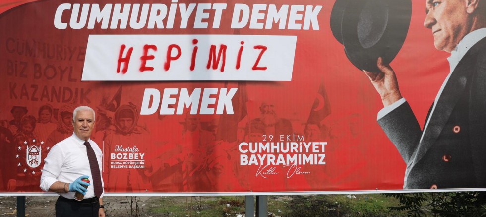Kampanyaya ‘Cumhuriyet demek, hepimiz demek’ diyerek katılan Bursa Büyükşehir Belediye Başkanı Mustafa Bozbey de sloganını billboarda sprey boyayla yazdı. 29 Ekim’de Cumhuriyet Bayramı coşkusunu yaşamak için tüm Bursalıları alanlara davet eden Başkan Mustafa Bozbey, “Cumhuriyet demek, hepimiz demek. Cumhuriyet demek, aydınlanma demek. Cumhuriyet demek, bağımsızlık demek. Cumhuriyet demek, vatan demek. Cumhuriyet demek, Atatürk demek. Onun için Cumhuriyete sahip çıkmak hepimizin sorumluluğudur. Hep birlikte en büyük bayramımızı kutlayalım. Cumhuriyeti gelecek kuşaklara hep birlikte taşıyalım” dedi.