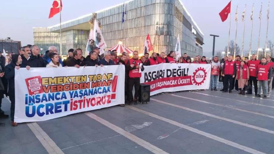 DİSK Güney Marmara Bölge Temsilciliği "Artık yeter, geçinemiyoruz" diyerek Kent Meydanı’nda basın açıklaması gerçekleştirdi. Yapılan açıklamayı DİSK Güney Marmara Bölge Temsilcisi Birleşik Metal İş Bursa Şube Başkanı Gökhan Aydın okudu.