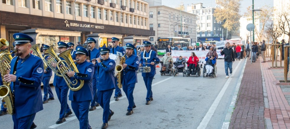 Dünya Engelliler Günü kapsamında ‘Engelli Farkındalık Yürüyüşü’ düzenlendi. Ulu Cami önünde bir araya gelen özel gereksinimli bireylere Bursa Büyükşehir Belediye Başkanı Mustafa Bozbey’i temsilen Büyükşehir Belediyesi Genel Sekreter Yardımcısı Mehmet Yıldız, Bursa Vali Yardımcısı Mustafa Güney, Bursa Kent Konseyi Başkanı Prof. Dr. Ertuğrul Aksoy, sivil toplum kuruluşlarının temsilcileri ve vatandaşlar eşlik etti. ‘Farklılıklarımızla Daha Güçlüyüz’ yazılı pankart taşıyan vatandaşlar, ellerindeki dövizlerle ‘Engel olma, farkında ol’ mesajı verdi. Büyükşehir Belediye Bandosu’nun da eşlik ettiği yürüyüş, Atatürk Anıtı’nda sona erdi. Saygı duruşu ve İstiklal Marşı’nın ardından çelenk sunumu gerçekleştirildi.