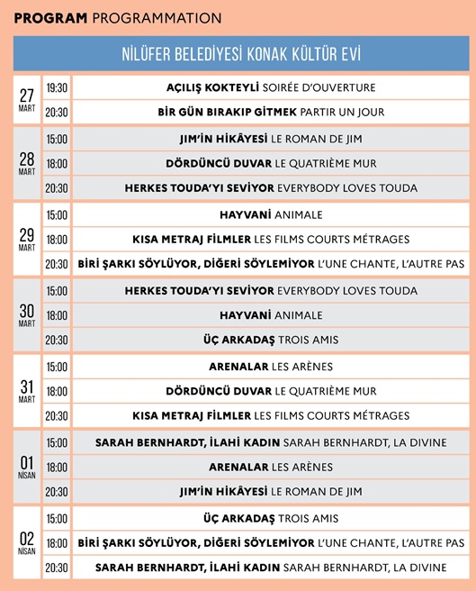 Nilüfer Belediyesi Konak Kültürevi’nin ev sahipliği yapacağı festival, 27 Mart günü açılış kokteyli ile başlayacak. Açılış filmi, aynı zamanda geçen yıl Cannes Film Festivali'nin açılış filmi olan “Bir Gün Bırakıp Gitmek” olacak. Gösterim kokteyl sonrası gerçekleşecek.