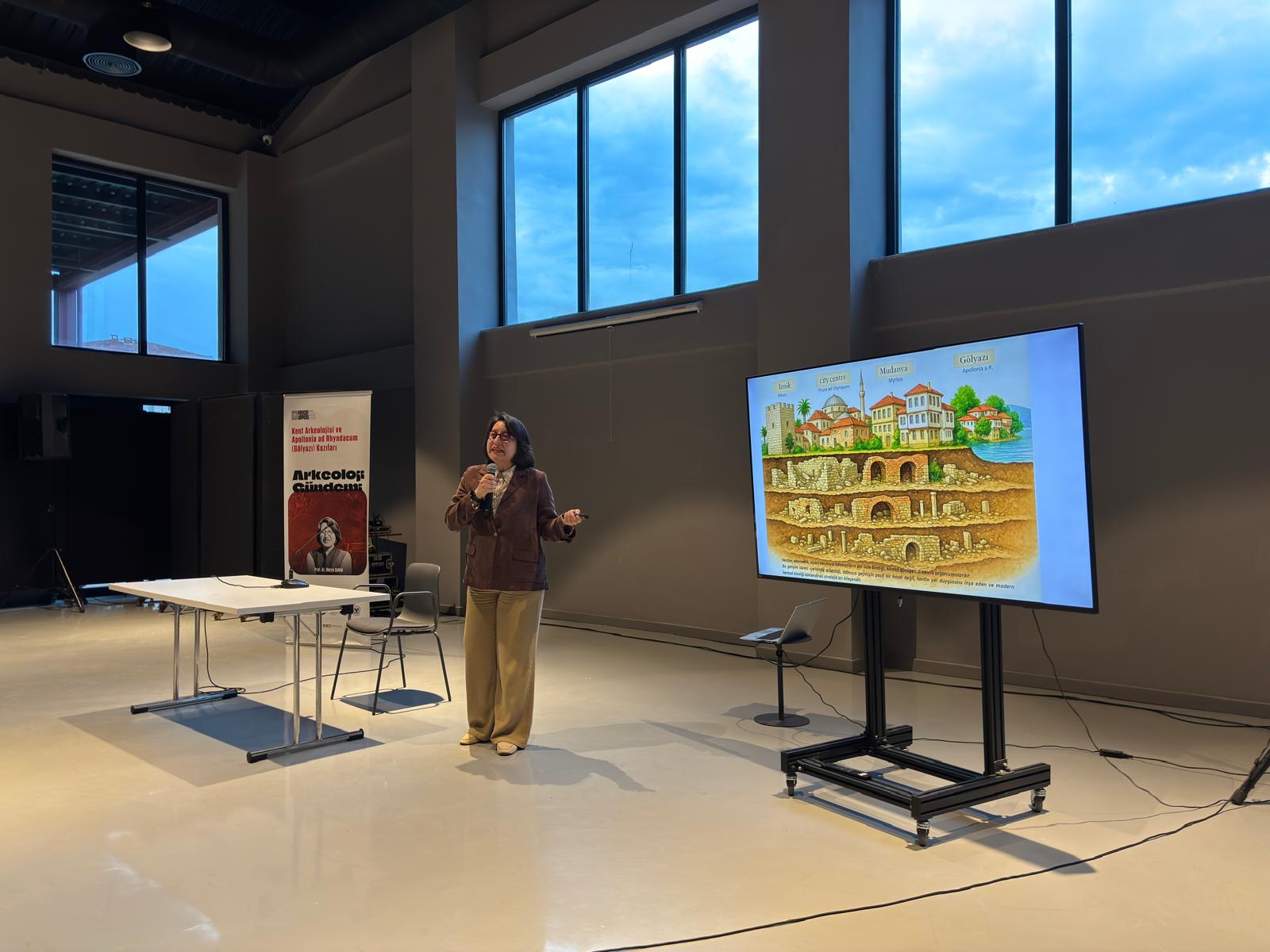 Nilüfer Belediyesi tarafından Pancar Deposu’nda düzenlenen Arkeoloji Gündemi söyleşisinin son konuğu Bursa Uludağ Üniversitesi (BUÜ) Arkeoloji Bölümü Ortaçağ Arkeolojisi Anabilim Dalı Başkanı Prof. Dr. Derya Şahin oldu. “Kent Arkeolojisi ve Apollonia ad Rhyndacum (Gölyazı) Kazıları” başlıklı söyleşide arkeolojinin, kenti anlamlandıran ve köklendiren bir araç olduğu konuşuldu.