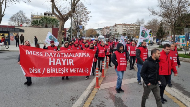 “MESS Grup TİS sürecine ilişkin sendikamızın 24 Aralık'ta açıkladığı yeni eylem kararları kapsamında bugün Bursa Mudanya'da yürüyüş ve kitlesel basın açıklaması gerçekleştirdik. Sendikamızın Genel Başkanı Özkan Atar, Genel Örgütlenme Sekreteri Fehmi Elmacı, Bursa Şubemizin yöneticileri, işyeri temsilcilerimiz ve üyelerimizin katılımıyla yapılan eylemde, ‘Metal işçisi direnişin simgesi’, ‘İşçiler açken patronlara huzur yok’, ‘Direne direne kazanacağız!’, ‘Sadaka değil, toplu sözleşme!’ sloganları atıldı. Genel Başkanımız, metal işçileri olarak patronların sefalet dayatmasına boyun eğmeyeceğimizi, kazanılmış haklarımızın gaspına izin vermeyeceğimizi, haklı taleplerimiz için sonuna kadar mücadele edeceğimizi vurguladı.”