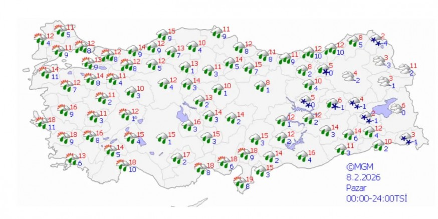 Meteoroloji Genel Müdürlüğü olarak yapılan değerlendirmelere göre yurt genelinin parçalı ve çok bulutlu, Mersin ve Karaman hariç yurt genelinin aralıklı yağışlı geçeceği tahmin ediliyor. Yağışların genellikle yağmur ve sağanak, Doğu Anadolu'nun doğusu, Sivas, Bayburt, Bingöl ve Tunceli çevreleri ile Doğu Karadeniz'in yüksek kesimlerinde karla karışık yağmur ve kar şeklinde olması bekleniyor.