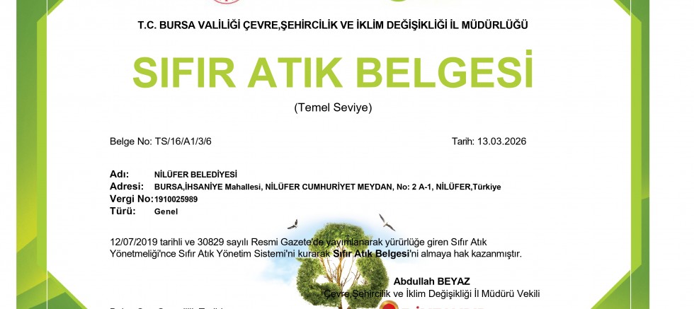 Nilüfer Belediyesi, 12 Temmuz 2019 tarihli Sıfır Atık Yönetmeliği kapsamında kurduğu sistemle Bursa Valiliği Çevre, Şehircilik ve İklim Değişikliği İl Müdürlüğü tarafından verilen Temel Seviye Sıfır Atık Belgesi’ni almaya ve yenilemeye hak kazandı. Söz konusu belge, 13 Mart 2031 tarihine kadar geçerliliğini koruyacak.