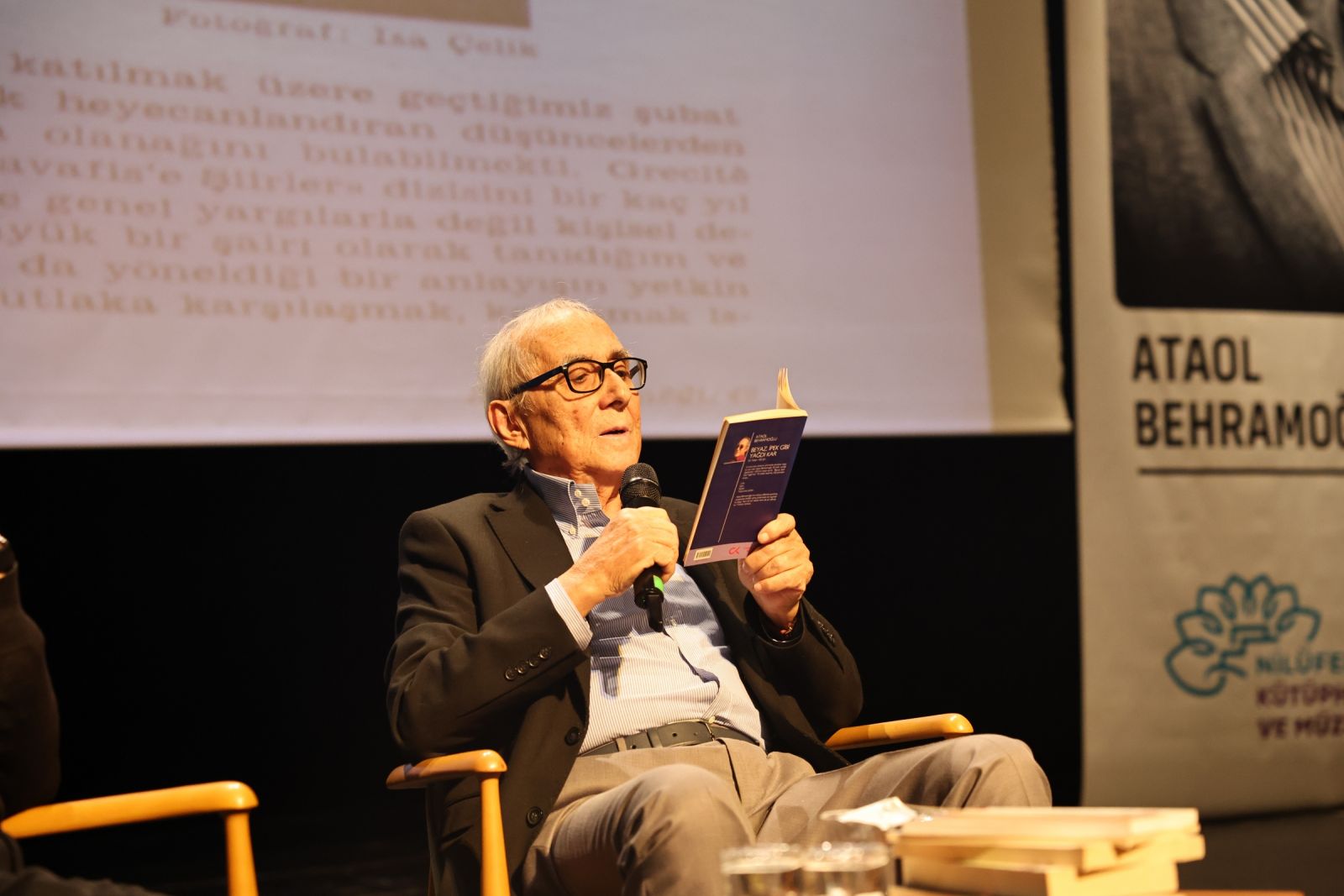 Sanatseverlerin ilgisi eşliğinde sahneye çıkan Ataol Behramoğlu da, Konstantin Simonov’un İkinci Dünya Savaşı sırasında yazdığı ünlü “Bekle Beni” şiirinin çeviri sürecinden bahsederek sözlerine başladı. Hayatta felsefe, şiirin önemini vurgulayan şair, duygu ve dildeki derinleşmenin şiirin temel şartı olduğunu belirtti. Ailesinden ve kendi hayat hikayesinden kesitler paylaşan Behramoğlu, katılımcılara, “Bir şey yapacaksınız hemen başlayın, ertelemeyin” tavsiyesinde bulundu. Usta şair, konuşması esnasında “Sonbahar Ezgisi” şiirini katılımcılar için okudu.