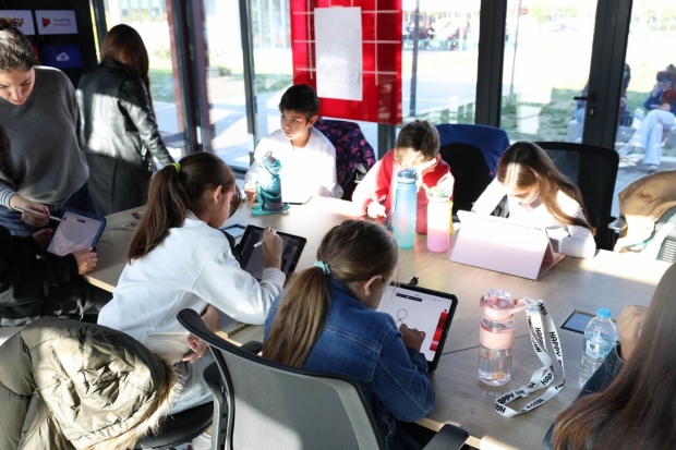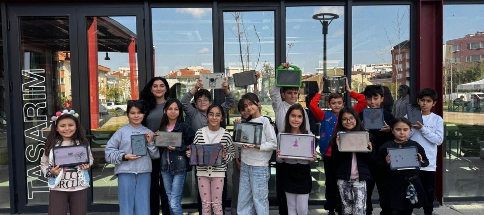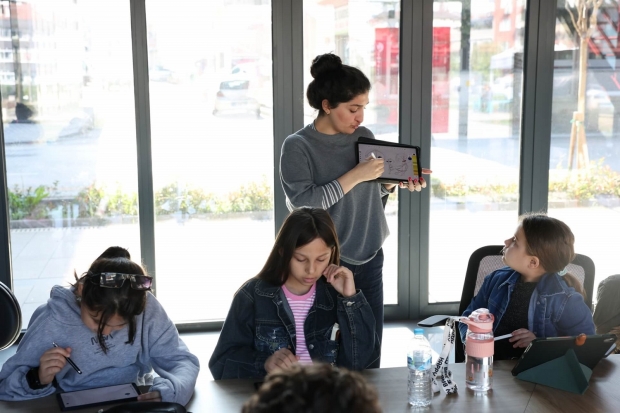 Çocuklar, atölye boyunca Sketchbook programını kullanarak tabletleri ve tablet kalemleriyle keyifli bir dijital sanat deneyimi yaşadı.
