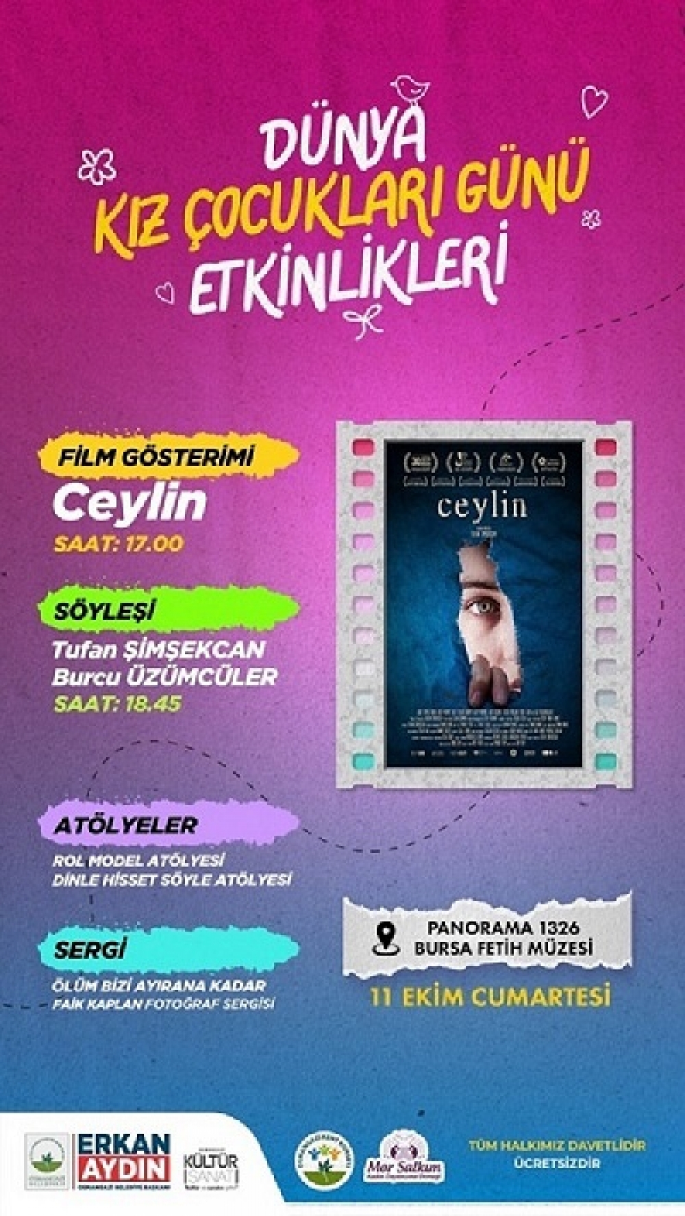 Kız çocuklarının gelişimlerine katkı sağlayarak eğlenceli vakit geçirmelerini amaçlayan Osmangazi Belediyesi, düzenleyeceği çeşitli aktivitelerle 11 Ekim Dünya Kız Çocukları Günü’nü kutlamaya hazırlanıyor. 11 Ekim Cumartesi günü saat 15:00’de Panorama 1326 Fetih Müzesi’nde düzenlenecek etkinlikler çadır kentte yaşayan ve tek hayali okula gitmek olan on dört yaşında mevsimlik tarım işçisi Ceylin’in hikayesini konu alan (Ceylin) filmiyle başlayacak. Çocuklar için Dinle Hisset Söyle ve Rol Model Atölyelerinin olacağı özel gün Burcu Üzümcüler ve Tufan Şimşekcan söyleşisiyle son bulacak. Etkinliğe katılanlar Faik Kaplan, tarafından hazırlanan “Ölüm Bizi Ayırana Kadar” fotoğraf sergisini de ziyaret etme imkanı bulacak.