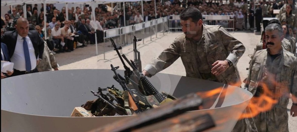 PKK, Abdullah Öcalan'ın çağrısı üzerine bugün gerçekleştirdiği törenle silahlarını imha etti. ANF, "Barış ve Demokratik Toplum Grubu” imzasıyla yapılan açıklamayı yayımladı. Açıklamada "Barış ve Demokratik Toplum sürecinin pratik başarısı için bir iyi niyet ve kararlılık adımı olarak ve bundan sonra özgürlük, demokrasi ve sosyalizm mücadelemizi, demokratik siyaset ve hukuk yöntemiyle yürütmek amacıyla ve demokratik entegrasyon yasalarının çıkarılması temelinde sizlerin huzurunda silahlarımızı özgür irademizle imha ediyoruz. Abdullah Öcalan'ın Silahın değil, siyasetin ve toplumsal barışın gücüne inanıyorum ve sizi de bu ilkeyi hayata geçirmeye çağırıyorum' ifadesine yürekten katılıyor ve bu tarihi ilkenin gereğini yerine getiriyor olmaktan büyük gurur ve onur duyuyoruz. Dünyada faşist baskı ve sömürünün arttığı, bölgemiz Ortadoğu’nun kan gölüne döndüğü ve halkımızın barış içinde özgür, eşit ve demokratik bir yaşama her zamankinden daha fazla ihtiyacının olduğu bu ortamda attığımız bu tarihi adımın büyük önemini, doğruluğunu ve aciliyetini görüyor ve hissediyoruz." denildi.