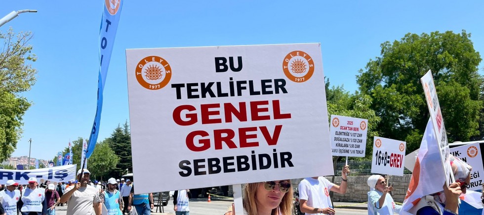 Türkiye İşçi Sendikaları Konfederasyonu, görüşmeleri süren ve 600 bin işçiyi ilgilendiren toplu iş sözleşmelerinin çerçeve protokolüne yönelik taleplerini dile getirmek üzere Anıtpark'tan Hazine ve Maliye Bakanlığı önüne yürüyüşe geçti.Kamuda 600 bine yakın işçiyi ilgilendiren toplu iş sözleşme görüşmeleri sürerken, TÜRK-İŞ, düşük zamma karşı Anıtpark'tan, Hazine ve Maliye Bakanlığı'na kitlesel yürüyüş başlattı.Yürüyüş kortejinin en önünde TÜRK-İŞ Başkanı Ergün Atalay, konfederasyona bağlı sendikaların genel başkanları, yönetim kurulu üyeleri ve şube başkanları yer aldı. Anıtpark'ta bir araya gelen emekçiler, ‘İş, ekmek yoksa barış da yok’, ‘ Birleşe birleşe kazanacağız’ ‘Şimşek çakmaya geliyoruz’ sloganlarıyla Hazine ve Maliye Bakanlığı'na yürüyor.