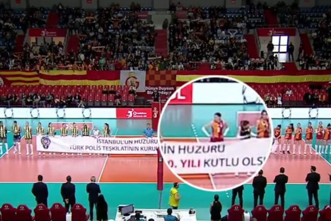 Galatasaray Kadın Voleybol Takımı Kaptanı İlkin Aydın, Fenerbahçe karşılaşması öncesinde tribünleri selamlarken maç hakemleri, takım arkadaşları ve rakiplerinin tuttuğu Türk Polis Teşkilatı'nın 180. kuruluş yılına dair açılan pankartı tutmadı.