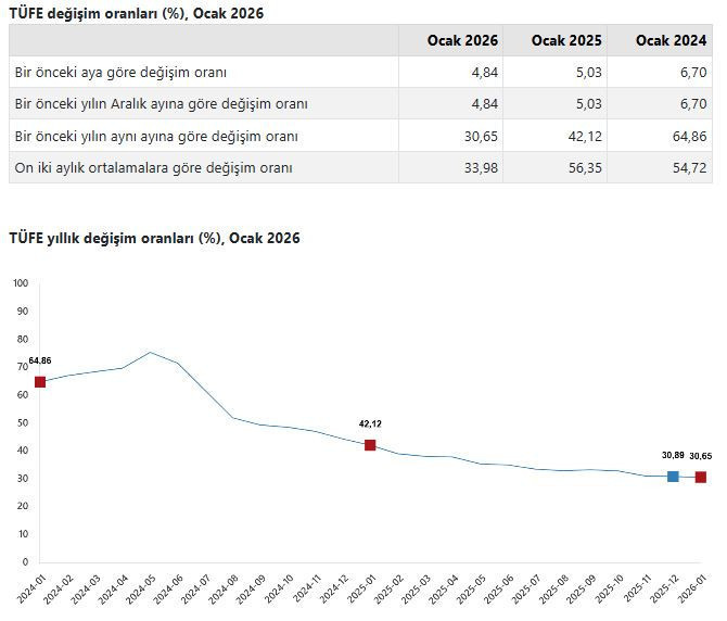 Türkiye İstatistik Kurumu (TÜİK) tarafından yapılan açıklamaya göre; TÜFE'deki (2025=100) değişim 2026 yılı Ocak ayında bir önceki aya göre yüzde 4,84 artış, bir önceki yılın Aralık ayına göre yüzde 4,84 artış, bir önceki yılın aynı ayına göre yüzde 30,65 artış ve on iki aylık ortalamalara göre yüzde 33,98 artış olarak gerçekleşti.